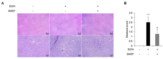 SMSP administration attenuates hepatic lipid accumulation in EtOH-treated rats. (A) Histopathological sections of liver were stained with H&E (magnification, ×40 and 100). (B) Hepatic steatosis scores were quantified from H&E-stained sections. The data represent mean ± SD (n = 4); *** p < 0.001 vs. normal group; # p < 0.05 vs. EtOH group.