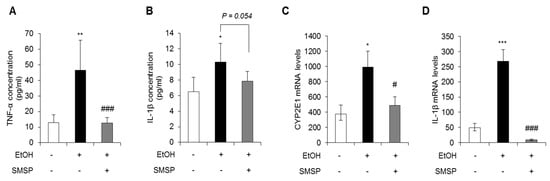 SMSP administration attenuates inflammation in EtOH-treated rats. Serum levels of (A) tumor necrosis factor-alpha (TNF-α) and (B) interleukin 1 beta (IL-1β) were measured by ELISA. The mRNA expressions of (C) cytochrome P450 2E1 (CYP2E1) and (D) IL-1β were detected by qRT-PCR in liver tissues from each group. The data represent mean ± SD (n = 4); * p < 0.05, ** p < 0.01, and *** p < 0.001 vs. normal group; # p < 0.05 and ### p < 0.001 vs. EtOH group.