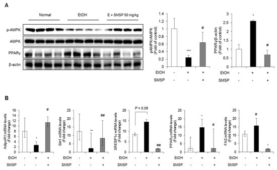 To examine the underlying molecular mechanism, we examined the effect of SMSP supplementation on hepatic lipid metabolism such as lipogenesis and free fatty acid (FFA) oxidation. AMPK is one of the key activators of the lipogenesis and FFA oxidation catabolism [23]; we tested whether prolonged SMSP supplementation could modulate the AMPK pathways in the liver of alcohol-treated rats. Western blot results showed that SMSP administration significantly increased the phosphorylation of AMPK reduced by ethanol treatment. However, PPARγ, the well-known lipogenic factor, significantly decreased in the livers of SMSP-fed rats (Figure 5A). The expression of lipogenic nuclear transcription factors, such as sterol regulatory element-binding protein 1c (SREBP1c), PPARγ, and fatty acid synthase (FAS), were down-regulated in the liver of SMSP-treated rats compared with the ethanol-treated rats (Figure 5B). However, SMSP supplementation restored the mRNA levels of adiponectin receptor 1 (AdipoR1) and sirtuin 1 (Sirt1) in the livers of ethanol-treated rats (Figure 5B).