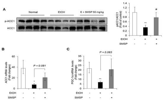 The inhibition of ACC1 has been reported to reduce hepatic triglyceride accumulation by decreasing lipogenesis and increasing FFA oxidation [24]. Therefore, we investigated the expression of ACC1 and the phosphorylation. As shown in Figure 6A,B, the phosphorylation of ACC1 was significantly inhibited in ethanol-treated rats while SMSP supplementation recovered the phosphorylation of ACC1. Moreover, the decreased hepatic expressions of ACC1 and peroxisome proliferator-activated receptor-gamma coactivator-1 alpha (PGC-1α) mRNA by ethanol treatment were recovered in SMSP-administered rats, although not statistically significant (Figure 6B,C). These results suggest that SMSP ameliorates EtOH-induced fatty liver through the regulation of lipogenesis and FFA oxidation mediated by AMPK and ACC1.