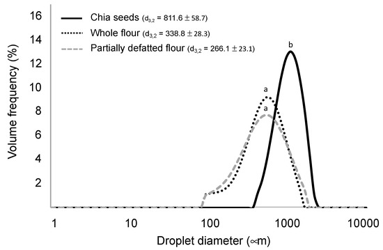 Moreover, in a prior gastrointestinal digestion simulation, the particle sizes of chia seeds and flours were determined in order to define the samples in terms of structural characteristics. As shown in Figure 1, chia seeds, after undertaking the oral stage, resulted in a mean particle diameter of 811.6 µm, which, as expected, was higher than in the completely unstructured flours, with both showing similar particle sizes (d3,2 being 338 and 266 µm in the whole flour and in the partially defatted flour, respectively). These results may be useful to understand the nutrient digestibility and bioaccessibility results in the coming sections, as nutrient release from the matrix is highly dependent on the degree of matrix disruption [10,18,36].