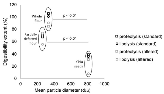 When assessing protein and lipid digestibility, the particle size of the different structures resulted in exerting a significant effect, so that lower particle sizes of the chia structures were associated with higher levels of proteolysis and lipolysis (Figure 2). Accordingly, both whole and partially defatted flours achieved significantly higher lipolysis extents than chia seeds. These matrices were highly disrupted, so the components of the seeds were supposed to be available as enzyme substrates. However, the partially defatted flour, despite having slightly smaller particle size, had lower digestibility extents. The possible reasons for this finding relate to different processing steps involved in the defatting process, which could have affected protein structure [37], and overall, led to the smaller ratio lipid/protein.