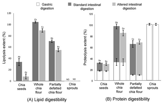 Lipid (A) and protein (B) digestibility in chia seeds, whole chia flour, partially defatted chia flour and chia sprouts during the gastric and standard (pH 7, bile salts concentration 10 mM) and altered (pH 6, bile salts concentration 1 mM) intestinal conditions. ND = non-detectable. Different capital letters (A–D) mean significant differences (p < 0.05) between chia products (chia seeds, whole chia flour, partially defatted chia flour and chia spouts). Different lowercase letters (a, b) means significant differences (p < 0.05) between intestinal conditions (standard and alternated) (data are expressed as mean values from three repetitions and the error bars represent the standard deviation).