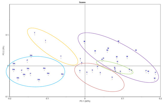 Principal component analysis—scores: RA—rape, T—thyme, P—polyfloral, S—sunflower, M—mint, and R—raspberry honey. Blue ellipse—rape honey group, yellow ellipse—thyme honey group, red ellipse—sunflower honey group, green ellipse—raspberry honey group, and purple ellipse—mint honey group.