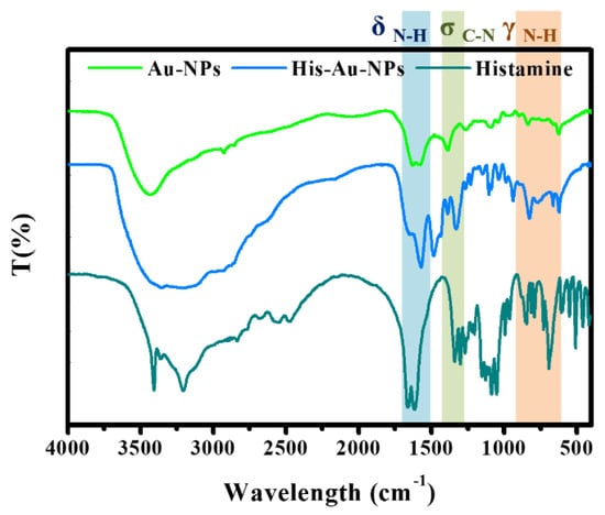 To explore the sensing mechanism of histamine detected by Au-NPs, FTIR spectrum was applied to study the structural changes, and the results illuminated the distinct functional groups of the reaction system. As shown in Figure 1, the correlation absorption peaks of Au-NPs at 1637 cm−1 and 1388 cm−1 are attributed to σC=O and σC-O, respectively, due to the decarboxylation molecules of synthetic product. Also, the strong characteristic band of histamine in the range of 1650–1600 cm−1 is assigned to C=N, and the absorption peak at 1564 cm−1 belongs to the in-plane bending vibration of the amine group. The band of 1120–1030 cm−1 corresponds to σC-N, and the primary amine groups were observed at 850–650 cm-1 and attributed to γN-H. After reacting with Au-NPs, the position of amine groups, including δC-N, σC-N, and γN-H, were remarkably strengthened; furthermore, the band of C=N double bond was also significantly enhanced, suggesting the positively charged functional groups might participate in electrostatic interactions with Au-NPs and large amine groups and unsaturated bonds on the surface of histamine-Au-NPs.