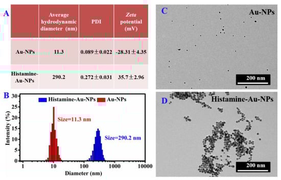 By DLS measure (Figure 2A,B), the average hydrodynamic diameter of Au-NPs after reaction with histamine increased from 1.3 nm to 290.2 nm, with a PDI value of 0.089 to 0.272, indicating that after the gold nanoparticles were combined with histamine, the dispersity was reduced, and the aggregation was enhanced. Zeta potential is consistent with DLS results, and the surface of Au-NPs is negative in charge (−28.31 ± 4.35 mV), while the histamine–Au-NPs surface is positive in charge (35.70 ± 2.96 mV) due to the NH2 functional group in the histamine, which enables it to attach to the negative charge of AuNPs. TEM micrograph (Figure 2C,D) also confirmed the active surface affinity of Au-NPs towards histamine. Compared with Au-NPs, the morphology of histamine-Au-NPs appears significantly aggregated.