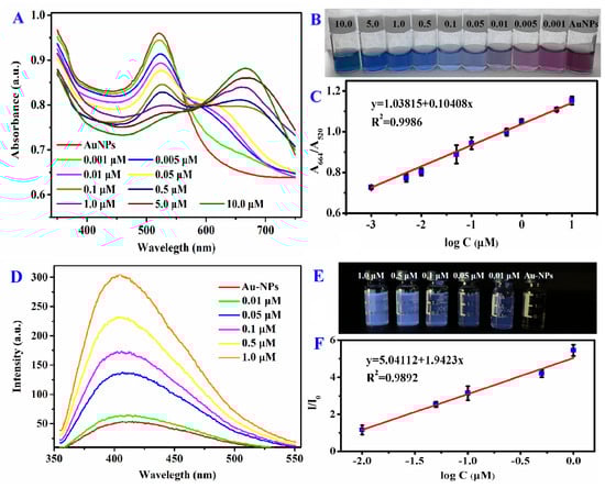 Gold nanoparticles (Au-NPs) have unique dispersibility, long-term stability, sensitive optical properties, and facile surface functionalization, and have been widely applied in biosensing determination, such as the detection of toxin [17,18], DNA [19], and amino acid [20]. However, up to now, Au-NPs probes for detecting molecular species have been based almost exclusively on colorimetric properties, lack multisensor properties, and cannot be flexibly applied in practical analysis.