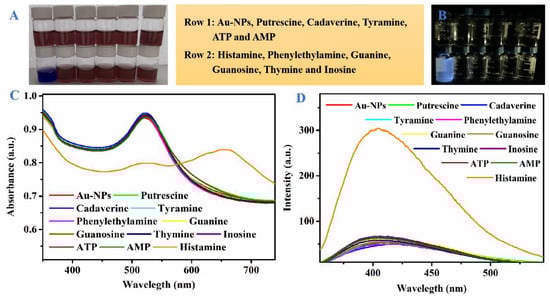 Figure 4. (A) colorimetric, (B) fluorescent response, (C) UV-vis spectra and (D)fluorescence spectra of Au-NPs added with different biological substances containing amino groups (histamine, putrescine, cadaverine, tyramine, phenylethylamine, guanine, guanosine, thymine, inosine, ATP, and AMP) at concentrations of 1.0 μM.