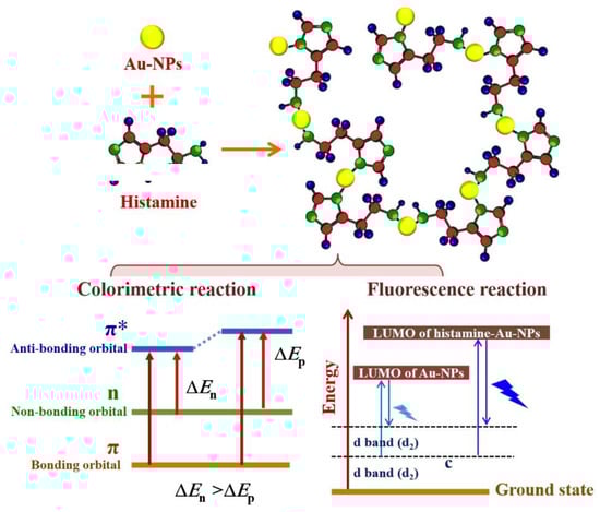 The key to the observed remarkable chromogenic reaction and fluorescence response is believed to be an amino role (Scheme 1). Au-NPs are negatively charged by the synthesis of Au (III) reduced and capped via citrate, and the electrostatic interaction occurred when Au-NPs are attracted by histamine that narrowed the interparticle distance between them. Histamine–Au-NPs are formed into massive networks, and the absorption coefficient orders of magnitude via the interaction of free-electrons and photons might be severely affected surface plasmon resonance absorptions enhance [21]. Moreover, the amino groups are linked with the Au-NPs, and n-π* conjugate occurs. Hence, the UV-vis absorption was distinctly red-shifted from wine red to dark blue, which could be observed by eye vision. Meanwhile, the large amino groups in the networks of histamine-Au-NPs have higher molecular orbital (LUMO orbital) in contrast to the original hydrogen-terminated groups of Au-NPs. As the electrons are excited, they would be relaxed to the ground state through a narrow optical band gap with the amino-fluorophore vibrations/rotations [22]. Hence, the solution of histamine-Au-NPs could exhibit excellent turn-on fluorescence behavior.