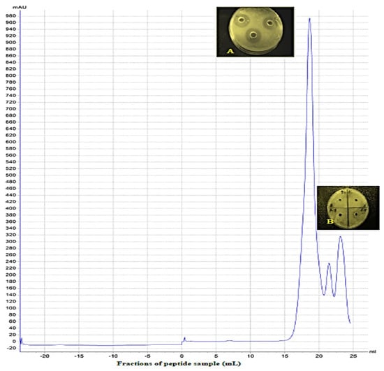 The extracted yeast peptides were passed through super filtration membranes of 10 kDa and 2 kDa and then freeze-dried. For further purification of the antibacterial peptide fractions, an ÄKTA purifier system was employed. Three peaks appeared after the ÄKTA Pure treatment. Fractions of 21–22 mL (peak 2) and 23–25 mL (peak 3) did not show growth inhibition activity against the two tested bacterial strains, while fractions of 16–20 mL (peak 1) showed the highest growth inhibition (Figure 1). The yield of the antibacterial peptide was 155 mg/100 mL of the culture medium. The inhibition zones were 24 and 20 mm for E. coli ATCC 25922 and Staphylococcus aureus ATCC 25923, respectively. Gram-negative bacteria (E. coli) appeared to be more sensitive to antibacterial peptide fractions than gram-positive (S. aureus) bacteria. These results were in agreement with Fakruddin et al. [13] who reported that Gram-negative bacteria were more sensitive to yeast peptides when compared to gram-positive bacteria. The inhibition activity of peptides increased proportionally with the α-helix of hydrophobic C-terminal peptides. This feature may be related to the composition of the amphipathic amino acids that are necessary for binding the bacterial cell membranes [19,22].