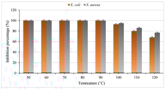 The effect of temperature on the S. cerevisiae antibacterial peptide was determined (Figure 2). The results showed that the antibacterial peptide from yeast was stable at different temperatures ranging from 50 to 90 °C during 30 min of treatment. Interestingly, an antibacterial activity of 93% and 95% for E. coli and S. aureus was sustained even at 100 °C during 30 min of treatment. After 120 °C for 30 min, the antibacterial activity of the peptide was 68% and 77% for E. coli and S. aureus, respectively. This thermostable property makes this antibacterial peptide suitable for use in sterilization and thermal processes. The thermal stability of this small peptide could be related to the nature and chemical structures of such peptides, including the primary protein’s structure and with low molecular weight. Similar reports have shown that antibacterial peptides isolated from different microbial sources are able to persist at high temperatures without any change in the antimicrobial activity [23,24].