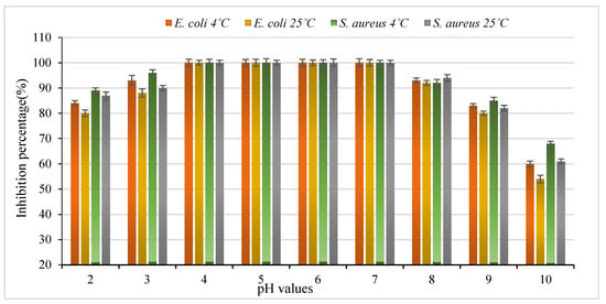 The inhibition activity of the peptide with extreme pH values 2, 3, 8, 9, and 10 against bacterial strains was also tested (Figure 3). Similar properties were previously studied for active peptides produced from yeasts, which were easily inactivated by strong acidic and alkaline conditions in different media. These characteristics limit the usage of peptides in food production with acidic and alkaline food. The antibacterial activity of this peptide was evaluated at different pH values at two temperatures (4 °C and 25 °C). The produced peptide was more effective at 4 °C within a pH range from 4 to 7 against the bacterial strains tested when compared to 25 °C. There was no significant difference (p > 0.05) between samples of S. aureus when tested at 4 °C and 25 °C at pH value 2, while there was a significant difference (p < 0.05) between samples of E. coli tested under the same conditions. In contrast, a significant difference (p < 0.05) between samples of S. aureus and E. coli tested at 4 °C and 25 °C at a pH value of 2 was observed. Furthermore, the analysis showed the presence of significant differences (p < 0.05) between samples of S. aureus tested at 4 °C and 25 °C at pH value 3. We also observed a significant difference (p < 0.05) between samples of E. coli when tested at 4 °C and 25 °C at pH 3. When comparing the two bacterial strains, we observed the absence of any significant difference (p > 0.05) between samples of S. aureus and E. coli tested at 4°C and pH 3. The presence of significant differences (p < 0.05) between samples of S. aureus tested at 4°C at pH 10 were also observed. However, no significant differences (p > 0.05) between samples of S. aureus tested at 25 °C and E. coli tested at 4 °C at pH value of 10 were observed. Interestingly, the lowest inhibition (%) value was observed in E. coli when tested at 25 °C and at pH 10.