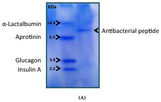 The molecular weights of the antibacterial peptide extracted from S. cerevisiae were analyzed using sodium dodecyl sulphate with 15% polyacrylamide gel electrophoresis (SDS-PAGE) as described by Judd [20]. Then, 1 mg/mL of the antibacterial peptide and standard proteins (α-Lactalbumin 14.4 kDa, Aprotinin 6.5 kDa, Glucagon 3.8 kDa, and Insulin-A 2.5 kDa) (Promega Company, Madison, WI, USA) were dissolved in a phosphate buffer and transferred to a vertical slab chamber (10 cm × 10 cm × 0.6 mm). The gel was run at 50 mA and 50–70V for 3 h. The molecular weight of the extracted antibacterial peptide was determined after the relative mobility (Rm) of the antibacterial peptide and marker proteins were determined per the following equation: