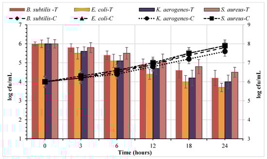 The antibacterial peptide effect of S. cerevisiae on cell viability (kill time) from four indicator strains is shown in Figure 5. The antibacterial peptide reduced the viability of target bacteria compared to the control sample. The antibacterial peptide’s efficacy depended on both the concentration of added peptide and exposure time. Additionally, the movement of small peptide and their spread during agar well diffusion appeared 3 h following the addition of the antibacterial peptide with 5.8, 5.5, 5.6, and 5.8 log (cfu/mL) reduction of B. subtilis, E. coli, K. aerogenes, and S. aureus, respectively. The statistical analysis of log (cfu/mL) reduction for each bacteria strain was estimated at interval times of 3, 6, 12, 18, and 24 h. The result showed that the antibacterial peptide effect on decreasing the viable cell counts was significant (p < 0.05) between the control samples and all four bacterial strains among the five interval times tested. In contrast, there was no significant difference (p > 0.05) between either Gram-positive strains or Gram-negative strains. In addition, the peptide’s inhibition effect on Gram-negative strains was highly significant (p > 0.05) when compared with Gram-positive strains. After 24 h of incubation, the peptide’s inhibition effect on Gram-negative strains was high compared with that of Gram-positive strains. The antibacterial peptide caused a decrease in the viable cell counts of gram-negative strains ranging from 2 to 2.3 log. units along the evaluated times in comparison to gram-positive strains which ranged from 1.5 to 1.8 log. units. The kill-time of this peptide was in agreement with that from earlier reports [29,30]. The mode of action of antimicrobial peptides fundamentally depends on the reaction of bioactive peptides with the membrane of bacteria cells and the cells’ internal composition [31]. Generally, the antimicrobial peptides were effective due to the electrostatic reaction with the cell membranes. In order to understand the mechanism behind antimicrobial peptides, the results of various methods have suggested that adsorption of bioactive peptides will occur on the bacterial cell membrane, leading to complete damage to the membrane. For example, the brave straw model, aggregate model, carpet model, and toroid pore model are critically considered models of bioactive peptides as antibacterial compounds [27,32].