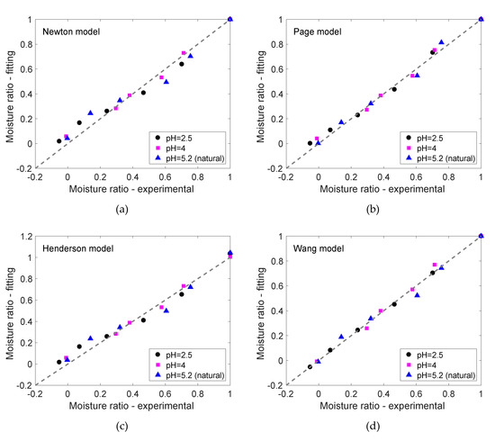 The goodness-of-fit for all models is illustrated in Figure 2, where experimental values are plotted against predicted moisture ratios for each drying model at all pH studied. This graph also shows the accuracy of the Page and Wang models, for which most of the predicted points lie on the correlation line (see Figure 2b,d).