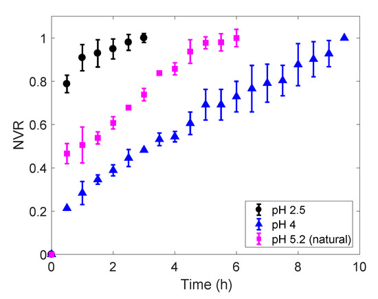 Release curves for the riboflavin encapsulated in freeze-dried 2% (w/w) gellan gums with different pHs. The vitamin content in the release medium is expressed as normalised vitamin released (NVR). Error bars correspond to triplicate tests.