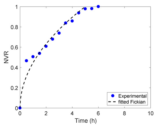 The first one () represents the Fickian part, while the second term () accounts for the relaxational contribution [24], which is related to stresses and state transitions of polymeric matrices. The dimensionless diffusional exponent mrel in Equation (10) can be determined from aspect ratio (i.e., height/diameter of the sample) correlations. For the ratio characterising the cylindrical samples used here (1.5), mrel = 0.43 [24].