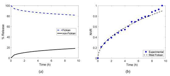 They are presented in Figure 5a. Overall, the Fickian contribution is predominant along the release process, i.e., overall , with values closer to 90% at the initial times of the delivery test, while relaxation effects are more important towards the end of the experiment, as the delivery of riboflavin is closer to completion.