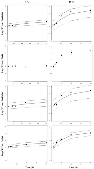 The time to reach (ttr) a population of 6 or 8 log CFU/mL is shown in Figure 6 and Table S3. These populations were found just before the carrying capacities were reached, and both fall within the linear period of the exponential growth where rates show a Log-Normal distribution regardless of the environmental conditions and the initial population of microorganisms [48,49,50]. At 7 °C E. coli spp. did not reach 6 log CFU/mL whether single-cultured or co-cultured. At 13 °C all E. coli spp. cultures reached 6 log CFU/mL at 1.60–2.24 day; similar results were found at 19 or 25 °C with lower ttr 6 log values showing a faster growth: 0.56–0.64 day or 0.32–0.40 day, respectively. All P. fluorescens cultures reached ca. 6 log CFU/mL after 0.56–0.72 day at 7 °C; the ttr 6 log results at 13 °C were slightly higher (0.64–1.12 day), decreasing at 19 and 25 °C and showing faster growth: 0.56–0.64 day and 0.40–0.48 day, respectively. The ttr 6 log values of P. fluorescens were lower than those from E. coli strains at all temperatures, indicating faster growth. All E. coli spp. and P. fluorescens cultures were able to reach a population of 8 log CFU/mL, except E. coli spp. at 7 °C. At 13 °C all E. coli spp. cultures reached 8 log CFU/mL at 3.36–3.68 d; lower results were found at 19 or 25 °C indicating a faster growth: 1.04–1.12 day or 0.56–0.96 day, respectively. All P. fluorescens cultures reached at 8 log CFU/mL after 0.96–1.04 d at 7 °C; the ttr 8 log results at 13, 19, or 25 °C were lower showing a faster growth: 1.44–1.76 day, 0.96–1.04 day, or 0.56–0.88 day, respectively. The P. fluorescens’s ttr 8 log values were lower than those from E. coli strains at all temperatures, indicating overall faster growth.