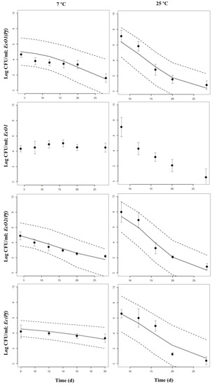 At 7 °C, decreasing populations of the three E. coli strains cultured alone were not detected (Table S1). Decreasing populations (k values) were not found for EcO2 and Ec strains single-cultured, and for EcO1(Pf), EcO2(Pf) and Ec(Pf) co-cultures at 13 °C. The positive k values are included within the Highest Posterior Density (HPD) intervals between a negative 2.5% interval value and a positive 97.5% interval value. The zero value is in the interval meaning that the estimated k values are not significantly different from zero, i.e., there is not growth nor decline with a 97.5% of confidence, and the populations are stable. The fastest k decline rates were observed in the EcO1(Pf) and Ec(Pf) co-cultures at 19 °C (–1.804 day−1 and –1.709 day−1, respectively). The higher k decline rates from single-cultured strains were found in EcO2 cultures at 19 °C (–0.233 day−1) and 25 °C (–0.247 day−1).