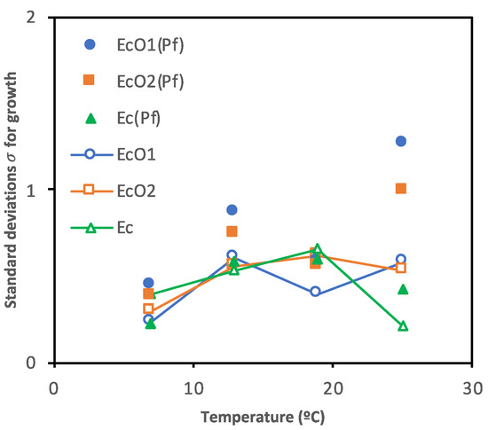 Scatter plot of the standard deviations for growth (σ) from E. coli spp. co-cultured with P. fluorescens (EcO1(Pf), EcO2(Pf), and Ec(Pf)) or single-cultured (EcO1, EcO2, and Ec) at 7, 13, 19 or 25 °C.