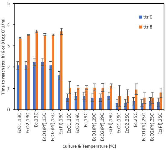 Time to reach (ttr; d) a population density of 6 or 8 log CFU/mL from E. coli spp. co-cultured with P. fluorescens (EcO1(Pf), EcO2(Pf), and Ec(Pf)) or single-cultured (EcO1, EcO2, and Ec) at 7, 13, 19 or 25 °C. Standard Errors are shown.