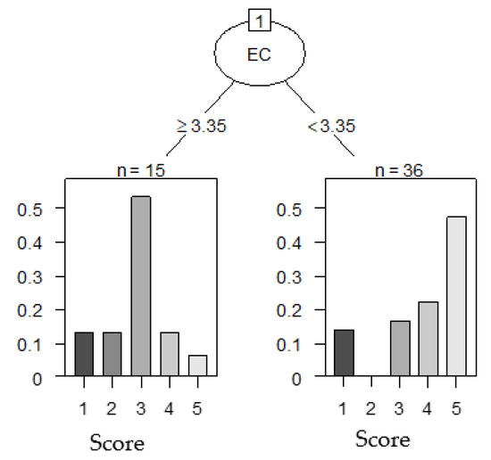 The CART analysis for visualizing the association of the airag properties with a score of airag showed that the airag scores were demarcated into two groups at the boundary of the EC-value of 3.35 (mS/cm). The group with an EC-value of less than 3.35 (mS/cm) included many of the four and five-point airags, and the group with an EC-value of 3.35 (mS/cm) or more included many of the two and three-point airags (Figure 2). Comparing the mean values of the respective properties between the high-score (≥4 points) group and the low-score (≤3 points) group, only the mean EC-values between the two groups were statistically significantly different. The mean EC-value of the high-score group was lower than that of the low-score group (Table 1). Spearman’s rank correlation analysis also showed a statistically significant relationship between the score and the EC-value, but not between the score and the other properties (Table 2). From these results, we considered that relatively high EC-values lowered the taste scores of the airag.