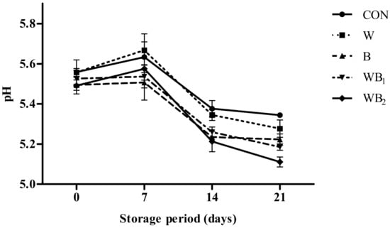 Changes in the pH values of pork patties with different treatments during refrigerated storage at 4 °C for 21 d. Error bars indicate standard deviations. CON (●), control (no additive(s)); W (■), addition of 2% whey powder; B (▲), addition of 0.5% B. serrata powder; WB1 (▼), addition of 2% whey powder and 0.5% B. serrata powder; WB2 (◆), addition of 2% whey powder and 1% B. serrata powder.