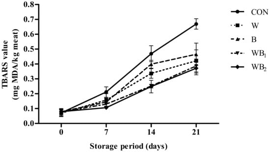 Changes in the 2-thiobarbituric acid reactive substances (TBARS) values of pork patties with different treatments during refrigerated storage at 4 °C for 21 days. Error bars indicate standard deviations. CON (●), control (no additive(s)); W (■), addition of 2% whey powder; B (▲), addition of 0.5% B. serrata powder; WB1 (▼), addition of 2% whey powder and 0.5% B. serrata powder; WB2 (◆), addition of 2% whey powder and 1% B. serrata powder.