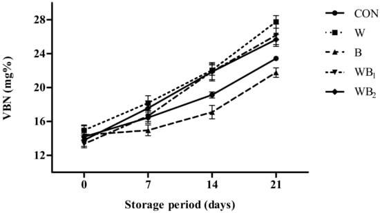 Changes in the volatile basic nitrogen (VBN) values of pork patties with different treatments during storage. Error bars indicate standard deviations. CON (●), control (no additive(s)); W (■), addition of 2% whey powder; B (▲), addition of 0.5% B. serrata powder; WB1 (▼), addition of 2% whey powder and 0.5% B. serrata powder; WB2 (◆), addition of 2% whey powder and 1% B. serrata powder.