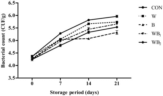 The results of microbiological analyses of the pork patties during storage are shown in Figure 4. The total aerobic bacterial counts in all groups increase with storage time (p < 0.05). Initially, no significant differences are observed among the treatments containing B. serrata, although their microbe counts are slightly lower than those in W and CON. The rich terpenoid content in B. serrata may be an important factor with regard to its antibacterial activity [49]. The control group exhibits the highest bacterial counts from 7 to 21 days. The number of aerobic counts is significantly lower in WB2 compared to the other treatments during 0–7 days; however, the B group shows the slowest growth rate and the lowest total bacterial count values from 14 days (p < 0.05). It may be that the AKBA in B. serrata can inhibit the formation of biofilms and lactoferrin in whey powder, thereby slowing bacterial growth, owing to their antibacterial capabilities [12,50]. Therefore, B. serrata and whey protein are capable of maintaining stability during storage, and Boswellia exhibits better antibacterial activity. Finally, neither E. coli nor other coliform bacteria were detected in any sample during storage in this study (data not shown).