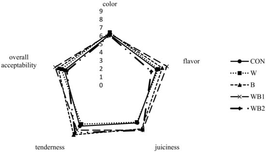 Figure 5 shows the sensory evaluation of the differently treated pork patties. All products achieve similar color scores irrespective of the formulation. Compared to other groups, the WB1 sample results in the highest sensory scores with regard to flavor, juiciness, and overall pork patty acceptability. This may be due to the aromatic components in Boswellia, which mainly comprise α-pinene, β-myrcene, linalool, and sesquiterpenoids that can convey a pleasant odor [47]. However, when added at 1%, the aroma, similar to spices, is too strong, such that WB2 has the lowest score for flavor (although without a significant difference compared to the control and whey groups). The scores for juiciness and tenderness are not significantly different among the WB1, WB2, and B samples; however, they are significantly higher than those of the W group (p < 0.05). The lower cooking losses are a result of the greater water-holding capacity arising from the Boswellia in WB1, WB2, and B; therefore, higher juiciness and tenderness values are observed, consistent with the TPA results.