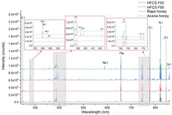 Average laser-induced breakdown spectroscopy (LIBS) spectrum of honey (acacia honey and rape honey) and high fructose corn syrup (HFCS 55 and HFCS 90).