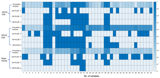 Feature variables selected with genetic algorithm (GA), variable importance in projection (VIP), and selectivity ratio (SR) methods. Row 1, 5, 9 shows the univariate analysis result between each variable and adulterant content of HFCS F55, HFCS F90, and rape honey, respectively. Cells with a gradient of blue color indicated the correlation coefficient. Other rows represented the variables selected by GA, VIP, and SR methods. Selected variables were represented in blue, and non-selected variables were in white.