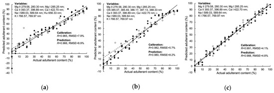 The scatter plot of the best model for quantifying adulteration ratio of HFCS 55, HFCS 90, and rape honey is shown in Figure 3. Among these three models, the quantification for rape honey achieved the best result, with r and RMSE of 0.988 and 4.8% in the prediction set. The samples in calibration and prediction sets distributed closely around the regression lines, and the regression lines almost went through original point. The emissions from Mg II 279.58, 280.30 nm, Mg I 285.25 nm, Ca II 393.37, 396.89 nm, Ca I 422.70 nm, Na I 589.03, 589.64 nm, and K I 766.57, 769.97 nm, which were the feature variables in the rape honey quantification, were also included in the other two models. It indicated that these variables might play an important role in honey adulteration analysis.