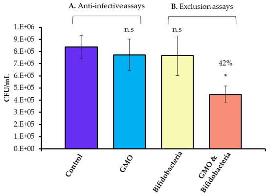 Anti-infective assays (A) demonstrating Campylobacter jejuni 81–176 adhesion in the absence and presence of GMO, and (B) competitive exclusion assays demonstrating Campylobacter jejuni 81–176 adhesion to HT-29 cells following pre-treatment of the HT-29 cells with Bifidobacterium longum subsp. infantis 15697 (yellow) and Bifidobacterium longum subsp. infantis 15697 pre-treated with GMO (orange). Results demonstrate the average colony forming units (CFU)/mL of adherent Campylobacter jejuni 81–176 of one representative triplicate experiment, with error bars representing standard deviation. The unpaired non-parametric t-test was used, *: p-value: < 0.05, n.s: not significant.