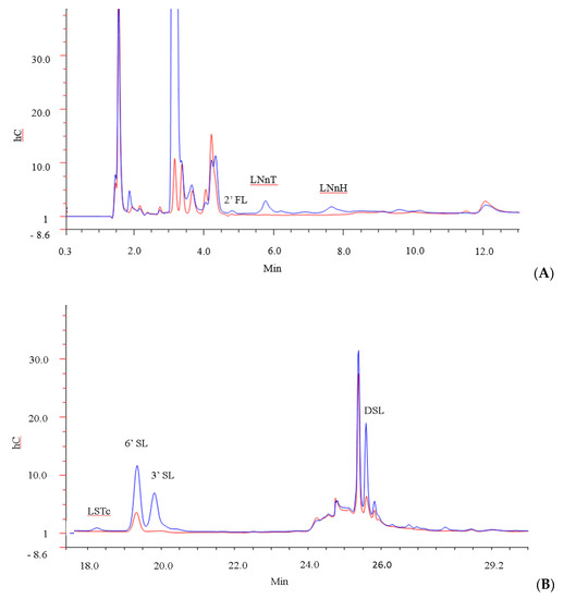 The ability of B. infantis ATCC 15697 to use multiple specific carbohydrate structures (2′FL, LNT, 3′SL, 6′SL, DSL, LNH, Sialic Acid, LSTc, LNnT and LNnH) within the pool was also investigated by generating HPAEC-PAD profiles of the oligosaccharides in the media before and after 24 h of bacterial growth (Figure 3). Notably, before the incubation period, a total of 24 peaks were detected in the GMO by the method used, of which six (3′SL, 6′SL, DSL, LSTc, LNnT and LNnH) were identified. Following 24 h incubation with B. infantis, 19 peaks were detected, of which 11 unidentified peaks were found in trace amounts that were not detected in the starting material. 2′FL, LNT, LNH, and free sialic acid were not detected at either time point. Overall, our results demonstrated that the strain was capable of utilizing multiple structures. For instance, 3′ and 6′ SL were depleted by 94% and 71% respectively, while LNnT and LNnH, were 100% utilised. LSTc was depleted by 94%, DSL was depleted by 43.1%, and lactose was depleted by 52%. This may be expected as B. longum subsp. longum has been shown to utilize free LNnT, one of the dominant components of HMOs, [66,67]. In addition, B. longum subsp. infantis BRS8-2 and TPY1201 are known to degrade 2′FL, 3FL, 3′SL and LNnT, while B. longum subsp. infantis DSM 20088 has been shown to utilise 2′FL, 3FL, and LNnT [68]. Therefore, it is likely that the prebiotic effect associated with GMOs may extend to other strains.