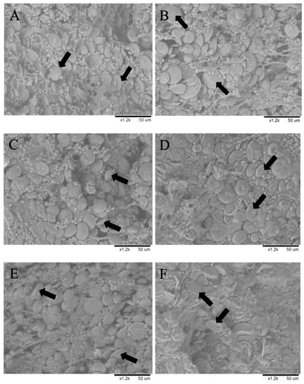 SEM micrographs of uncooked (left) and cooked (right) GP0 (A,B), GP5 (C,D), and GP10 (E,F) pasta samples. The black arrows indicate starch granules.