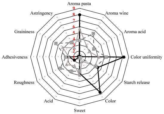 Sensory scores of quality attributes of pasta fortified with grape pomace at different addition levels (GP0 black solid line; GP5 solid gray line; GP10 dashed gray line).