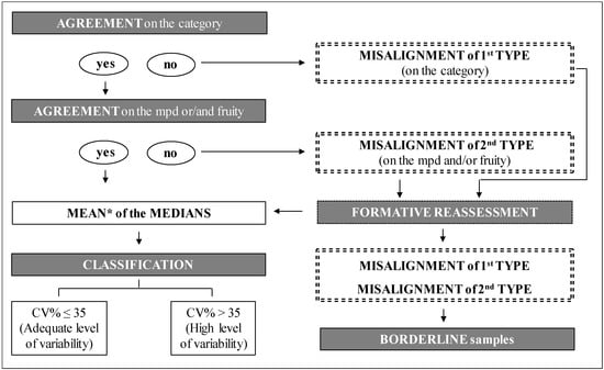 The adopted decision tree is based on the agreement (more than 50% of panels) on the category and on the median of the intensity of the main perceived defect (mpd) and/or of the fruity attribute. If one of these two agreements was not reached, a first or second type of misalignment occurred, and the sample was not classified. Following the flow of the decision tree, the UNIBO panel leader first checked whether the sensory data provided by at least four out of six panels defined the sample as belonging to the same quality grade; if yes, agreement on the mpd was also checked, while in the negative case, formative reassessment was required.