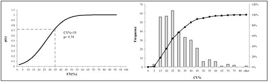 If the desired agreement was met for both criteria, it was possible to proceed with calculation of the mean of the medians (provided by each panel) for classifying the samples. The coefficient of variation (CV%) was applied and considered satisfactory if ≤35% (adequate level of variability). The adoption of 35% as upper limit of CV was selected by observing the frequency distribution of all CV% values registered for the mpd and fruity attribute for the set of samples analyzed. The frequency distribution was also expressed as cumulative probability (p = 0.74) applying the t-test (Figure 2).