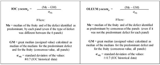 Therefore, the intensity, and also the type of the mpd, was considered in the OLEUM version of the z-score to obtain a reliable dataset for comparison with instrumental data (e.g., in OLEUM for developing screening methods based on the analysis of volatile compounds). The detailed formulas of both the methods used to calculate the z-score are shown in Figure 3.