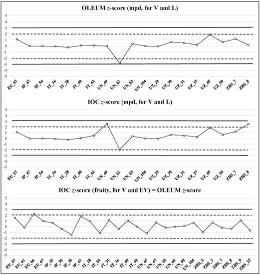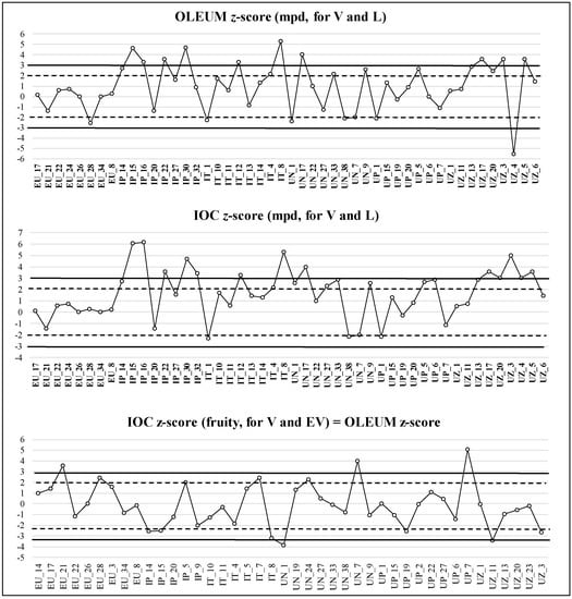 The z-score has positive or negative values and was calculated for both fruity (for EV and V category) and negative sensory attributes (for V and L category); the central value is zero, the warning limits for the index are ±2, and the action limits are ±3. The interpretation is the same for both the methods applied (IOC and OLEUM): if |z| ≤ 2, performance was satisfactory; if 2 < |z| ≤ 3, performance was questionable; finally, if |z| > 3, performance was considered unsatisfactory. Each panel leader, observing this chart, had to define any corrective or/and preventive actions taken if a result is outside of the limits or if several consecutive results are obtained at the same side (positive or negative) of the central value (bias) []. The results obtained verified that the approach using the z-score represents a very useful tool to evaluate the trueness of the panel over time.