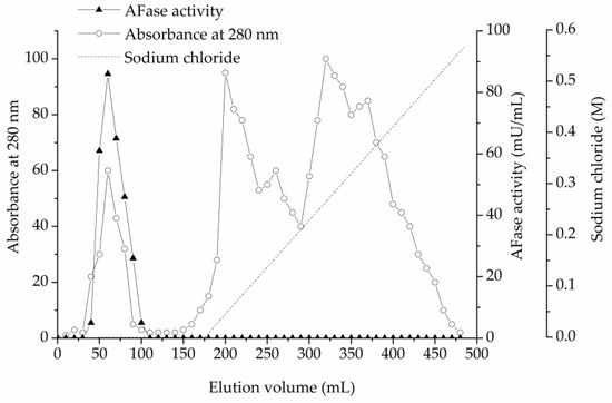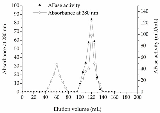 As described in the materials and methods section, an AFase was purified to apparent electrophoretic homogeneity from the culture filtrate of T. reesei CICC 41495. Protein content and enzyme activity of each fraction were estimated at each step during the chromatography. The protein content was monitored at 280 nm. For direct UV measurement at 280 nm, the protein solution alone was used, without the addition of reagents, thus the measurements are quick. The AFase activity appeared as a major peak at the void volume through ion-exchange chromatography on the DEAE-Sepharose Fast Flow column, which is shown in Figure 1. Column fractions with AFase activity were pooled, concentrated, and further separated through gel-filtration chromatography on the Sephacryl S-100 column, and the elution profile is shown in Figure 2.