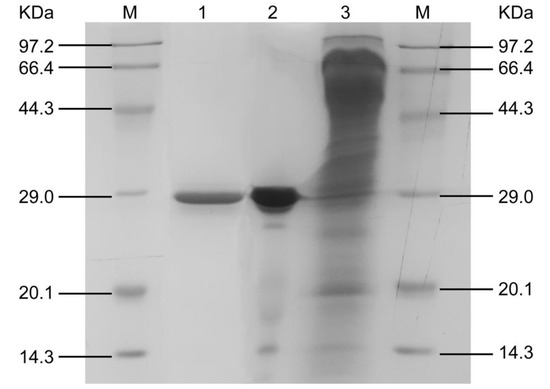SDS-PAGE profile of each step during the purification is shown in Figure 3. The purified AFase appeared to be a single protein band with a molar mass of 29.0 kDa in the SDS-PAGE gel.