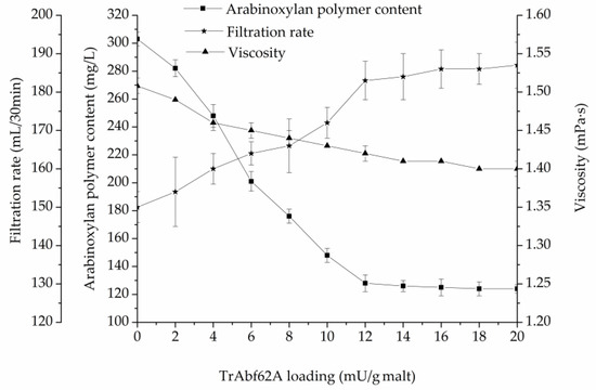 The effects of TrAbf62A supplementation on the arabinoxylan polymer content, viscosity, and filtration rate during mashing are illustrated in Figure 5.