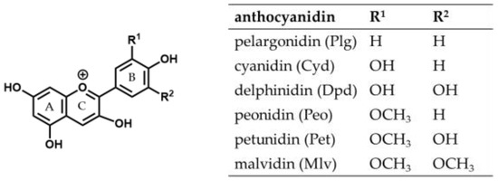 Anthocyanins are water-soluble natural red and blue pigments found in flowers, fruits, and vegetables. They are polyphenols and belong to the subgroup of flavonoids [1], consisting of an anthocyanidin aglycon to which a saccharide moiety is bound. There are many different anthocyanin structures in nature. They differ in the number and position of hydroxyl and methoxy groups on the aglycon and the nature and position of glycosyl residues [2]. Approximately 90% of all anthocyanins in plants possess a cyanidin (Cyd), delphinidin (Dpd), pelargonidin (Plg), petunidin (Pet), peonidin (Peo), or malvidin (Mlv) structure as the skeleton (Figure 1) [3].