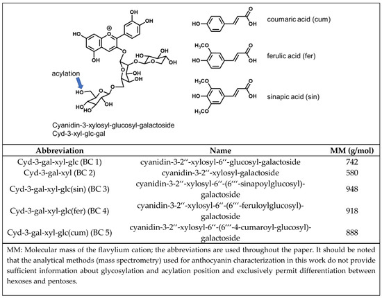 Due to its high anthocyanin content (4−1799 mg/100 g dry weight or 1−44 mg/100 g fresh weight [3], 1−98 mg/100 g fresh weight [4]), which corresponds to 25%−50% of the total polyphenol content [5], black carrot (Daucus carota ssp. Sativus var. Autrorubens Alef.) is a popular source for the preparation of coloring extracts. The five major anthocyanins of black carrot are cyanidin-based structures (Figure 2). These are cyanidin-3-xylosyl-galactoside (Cyd-gal-xyl), cyanidin-3-xylosyl-glucosyl galactoside (Cyd-gal-xyl-glc) and its derivatives acylated with sinapic acid (Cyd-gal-xyl-glc(sin)), ferulic acid (Cyd-gal-xyl-glc(fer)), and coumaric acid (Cyd-gal-xyl-glc(cum)) [5]. Peo- and Plg-glycosides have been detected as well, to a markedly lesser extent, however. Acylated structures usually make up 55%−99% of black carrot anthocyanins. The most abundant anthocyanin is Cyd-gal-xyl(fer), which accounts for 40%−80% of the total anthocyanin content [4,5]. Due to the high proportion of acylated anthocyanins, which are responsible for the good color stability under weakly acidic conditions, coloring extracts prepared from black carrot are frequently applied to dairy products [6].
