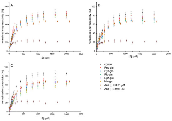 The IC50 values of the different anthocyanins were derived from the inhibition constants for different substrate concentrations by the Cheng−Prusoff equation (Equation (9)) [23].