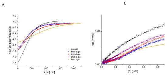 Due to the high self-absorption of anthocyanins at 405 nm, their effect on enzyme inhibition is impossible to distinguish by UV/Vis detection for concentrations above 50 µM. Therefore, according to our previous study [16], the inhibitory effect for 100 µM was additionally investigated by ITC. Substrate conversion was performed in the cell by a single enzyme addition in the presence or absence (control) of the inhibitor, and the thermal power to maintain a constant temperature (µcal/s), which is proportional to the reaction heat, was recorded over time [18,19,25]. The amplitude of the curve immediately after enzyme injection was reduced; the time span to return to the pre-injection base line, indicating the end of the reaction, was extended in the presence of the anthocyanin-3-glucosides (Figure 4A) [26]; and the thermogram was converted into a Michaelis Menten diagram (Figure 4B). Due to the higher concentration (100 µM), differences between the anthocyanin structures become more obvious. Nevertheless, the order of the inhibitory strength is identical to the lower concentrations detected by UV/Vis (Mlv-3-glc > Cyd-3-glc > Dpd-3-glc~Peo-3-glc).